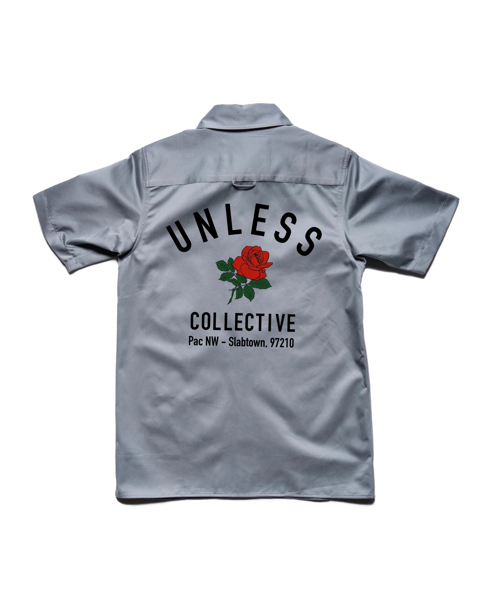 Check out our take on the traditional work shirt. We’ve embellished ours with a premium printed UNLESS Collective rose graphic on the back and a name tag on the front. This is one work shirt you might not want to get dirty.